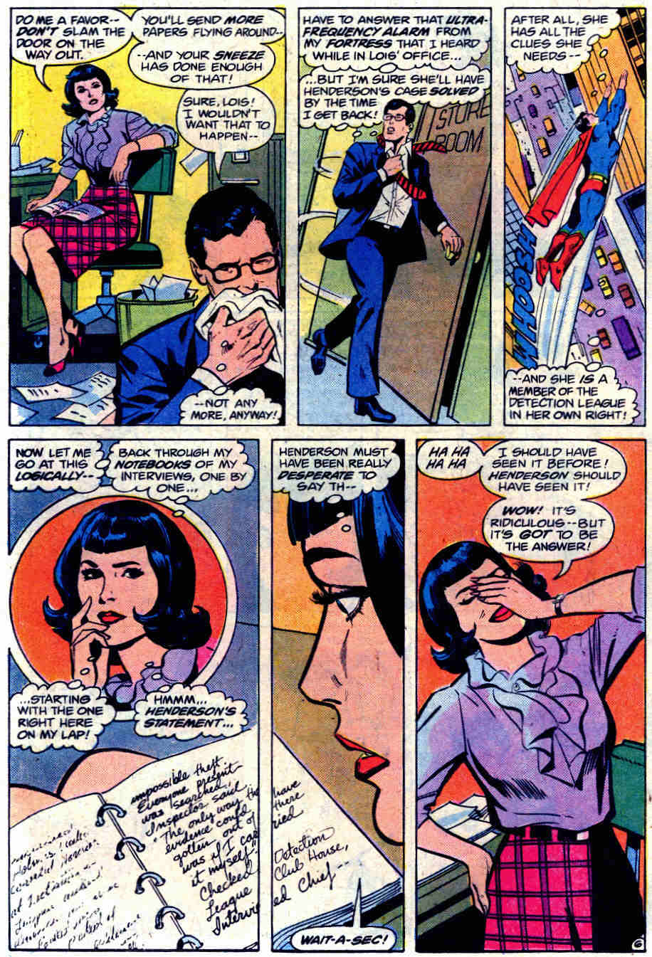 4 épisodes au menu du jour : tout d'abord celui d'Actions Comics 283 de décembre 1961 où notre limier y apparaît grâce à de la Kryptonite rouge, puis dans Adventures comics 296 de mai 1962 c'est Bizarro pipe au bec et Deerstalker enfoncée sur la tête, (clone du sauveur éternel de Métropolis, que je fais entrer dans la catégorie des artefacts pour la cohérence de ce sujet) qui essaye de résoudre un mystère à la manière de Perry Mason ! Ensuite c'est au moyen d'un masque étrange du museum de Smallville que Lana Lang convie le limier de Baker Street à participer au scénario de l"histoire et enfin dans "The Superman Family" vol. 28 n°213 de 1981 (ou Superman poche 71 chez Sagedition pour la version française de 1983, que je vous présente également), Loïs Lane marche sur les traces de Sherlock Holmes en enquêtant sur la disparition d'un trophée à l'image de ce dernier.